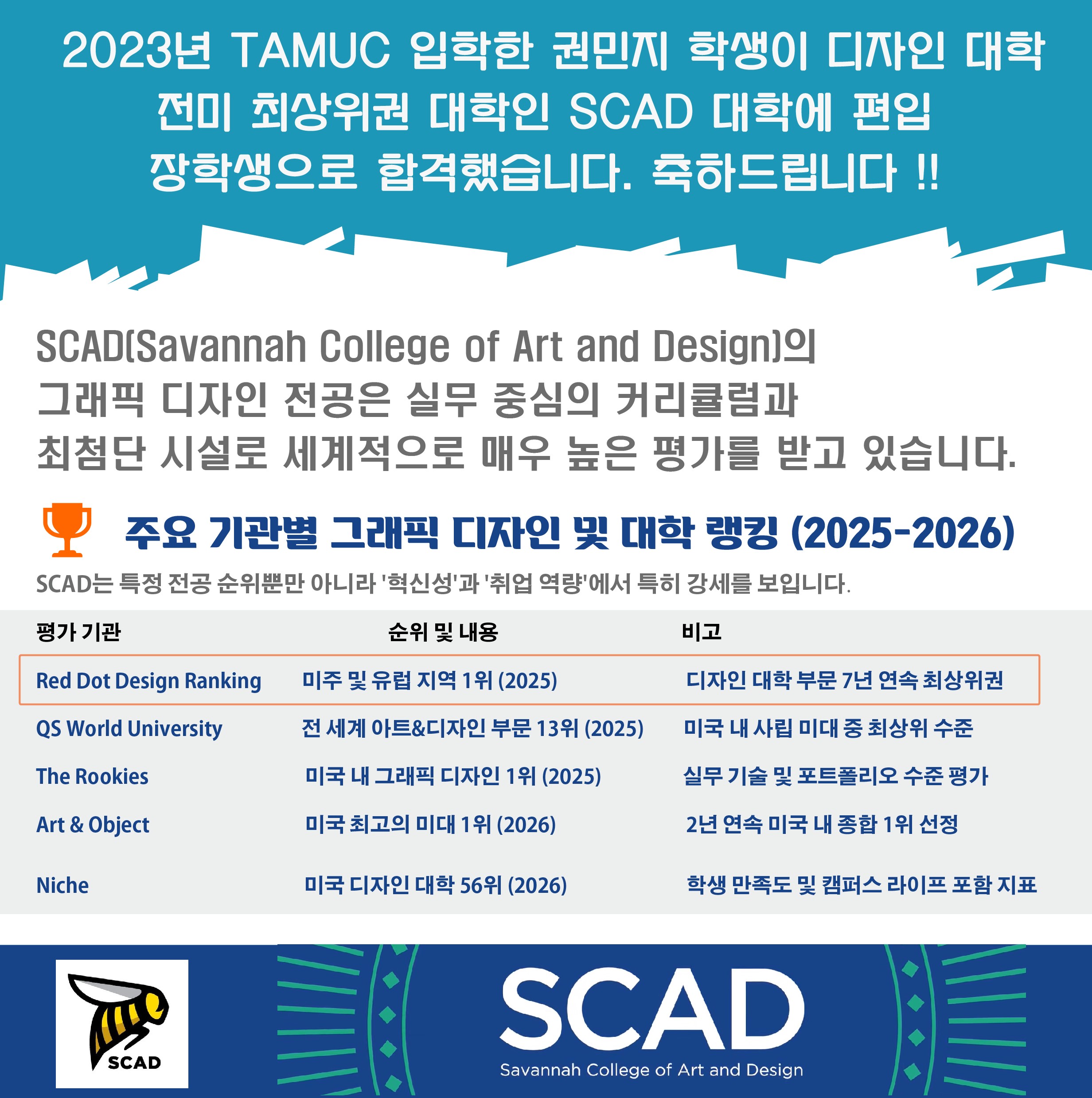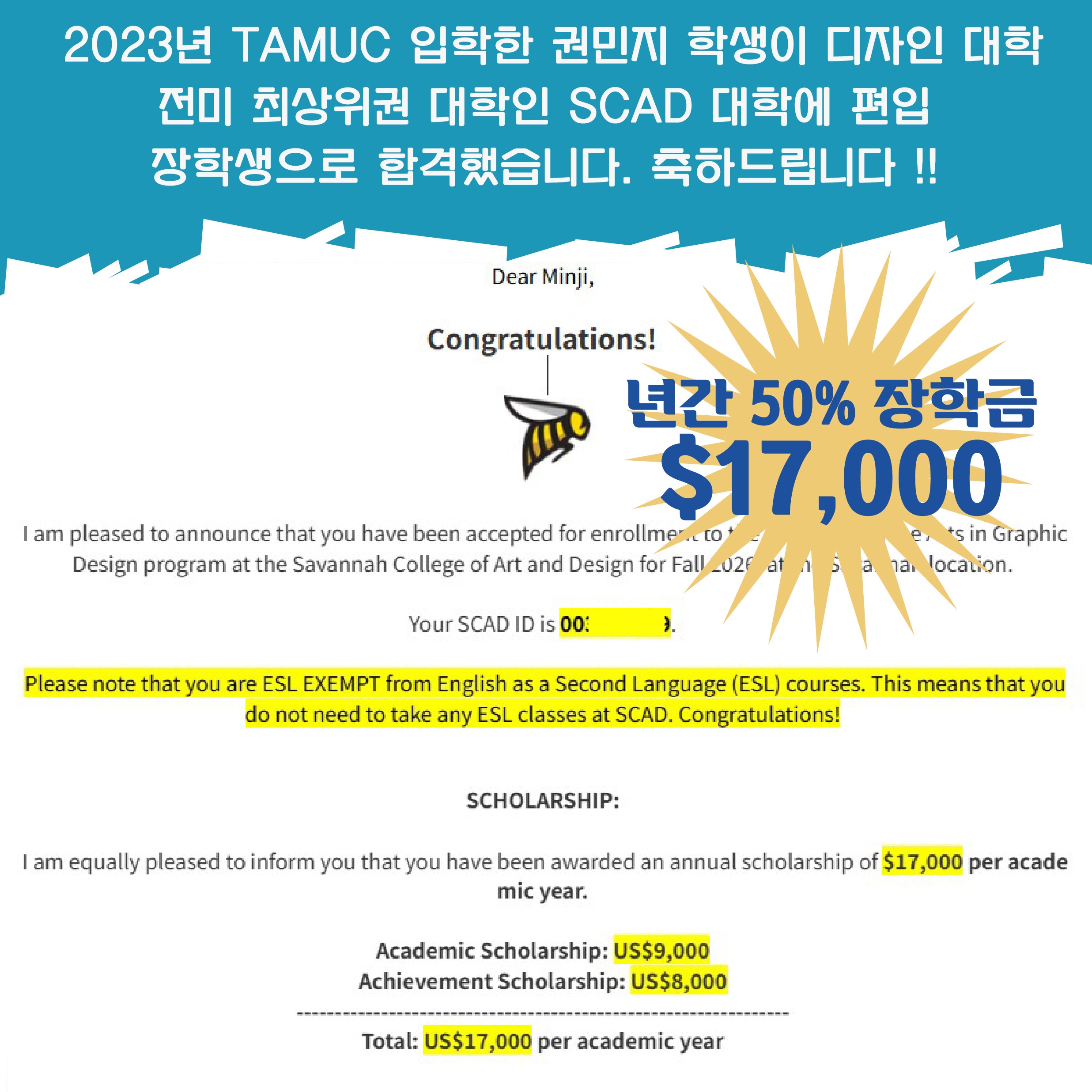 SCAD 50% 장학생 입학 " 권민지 학생"