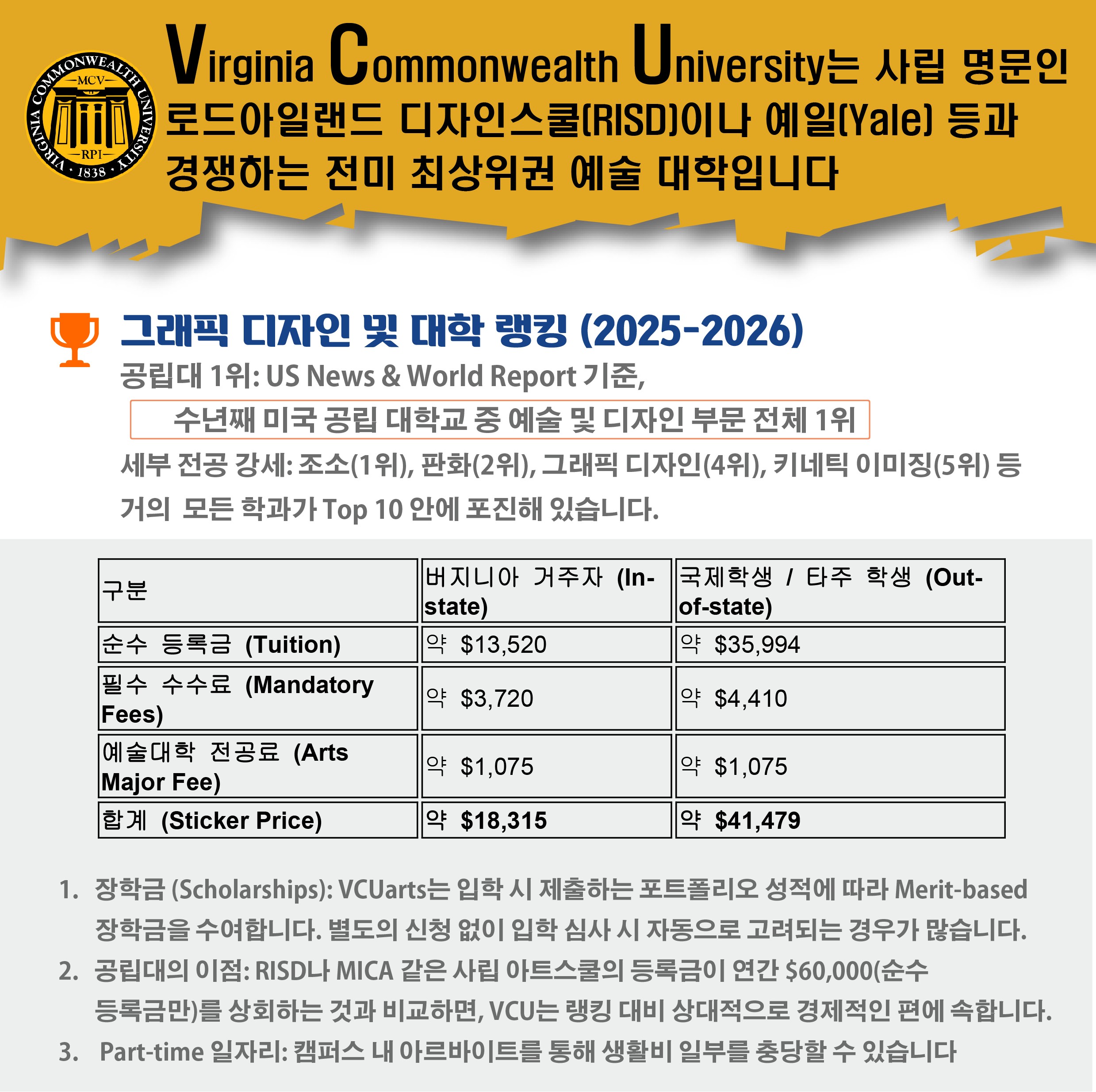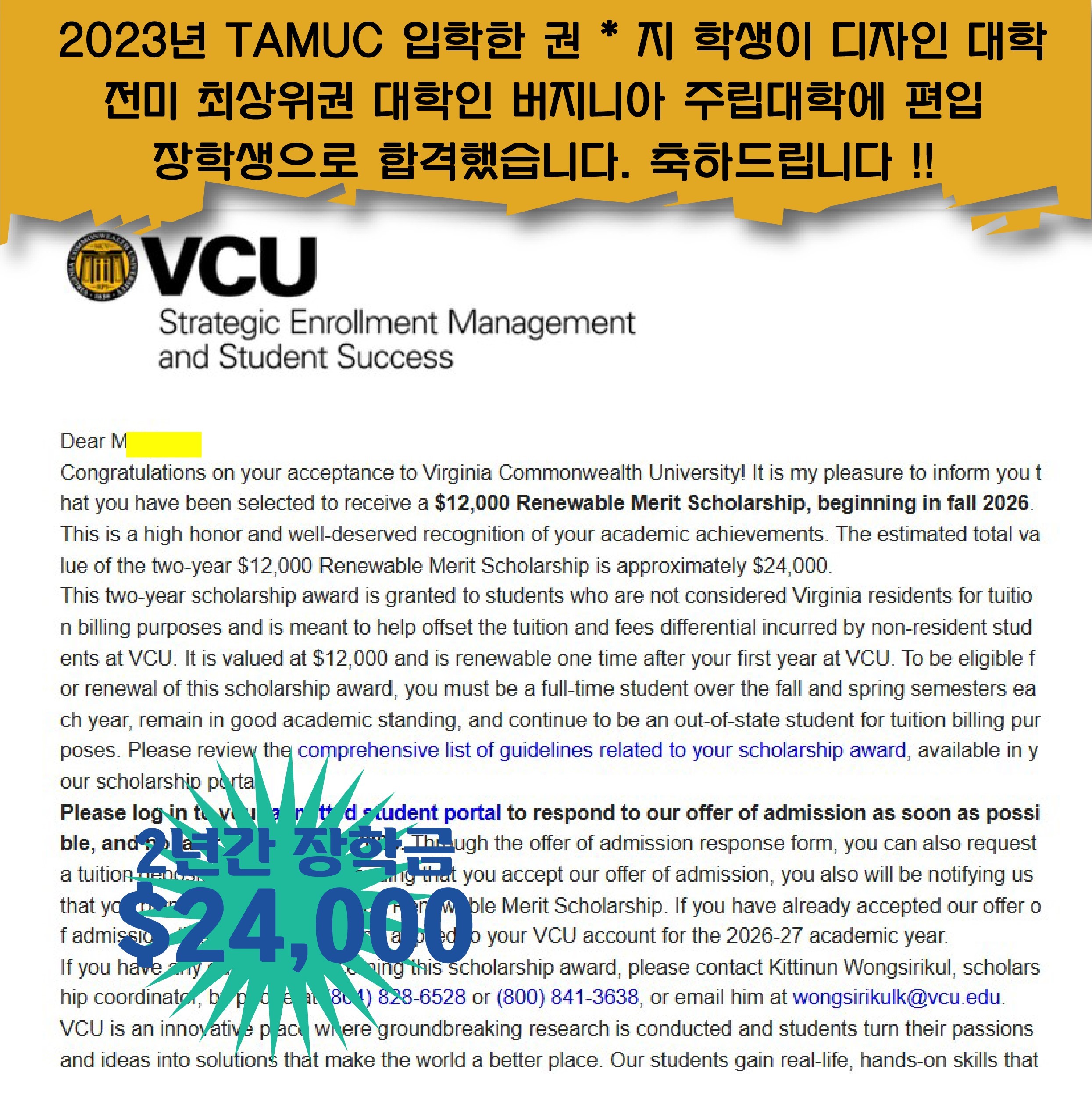2024년도 한국교육원에서 진학한 권*지 학생이 미국 US News Ranking 최상위권 대학인 버지니아 주립대학교 그래픽 디자인 전공으로 편입 장학생으로 합격했습니다.